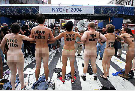 ACT UP protested naked outside of Penn Station on the eve of the Republican National Convention in NYC, demanding that the Bush Administration drop the debt of poor countries with large HIV/AIDS epidemics. ACT UP & Health GAP and allies pushed for debt reduction in a sustained movement with other allies that resulted in over $100 billion of debt cancelled in 29 countries–freeing up money to pay for the fight against AIDS and to pay health workers instead of paying back rich-countries’ banks.