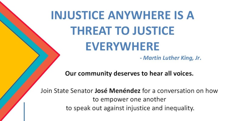 Join State Senator José Menéndez for a conversation on how to empower one another to speak out against injustice and inequality.