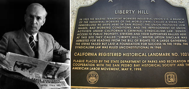 Novelist Upton Sinclair was arrested on Liberty Hill in what is now part of Los Angeles at a rally in support of striking marine transport workers. Sinclair had just begun to read the Bill of Rights when he was arrested, and a police officer exclaimed, “We’ll have none of that Constitution stuff.” Sinclair and others were arrested and held incommunicado for four days.