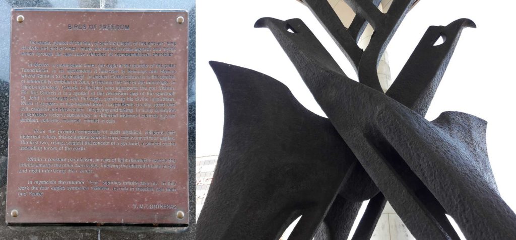 “Birds of Freedom,” installed by Mexican artist Victor Manuel Contreras in 1982, is at the entrance to the Pyramid Building (on the north side of Loop 410, across the highway from North Star Mall.) In the words of the artist, “The eagle, symbol of the Sun, of spiritual flight, of fire and air, king of birds and bird of kings, many and varied are the legends and myths which through the ages have reflected the representational character. In Mexico, in prehistoric times, the eagle is the founder of the great Tenochtitlan [site of current Mexico City]. In its movements it indicates Romulus and Remus where Rome is to be erected. In ancient Greek culture it is the symbol of immortality, emblem of Zeus, to become the fire of the immortals. In Hindu mythology, Garuda is the bird who transports the god Vishnu. For the church it is a symbol of the Ascension and of the spiritual. St. John is portrayed with the eagle, signifying his divine inspiration. When it appears in two-headed form, it represents duality, good and evil, creation and destruction, life giving and taking. In many countries it expresses victory, supremacy, in different historical periods it is an emblem, patriotic, mythical, minted in coin. From the premise composed of such mythical, religious and historical values, this sculptural work is born, consisting of four eagles. The first two, rising, suggest the concept of a pyramid, a symbol of the ascending forces of the earth. Within a constant parallelism, in rays of light directed towards the infinite emerge the other two eagles, implying the eternal duality of day and night interlacing their wings. In mysticism the number “four” signifies infinite security. In this work the four eagles symbolize freedom, as only in freedom can man find Peace!”