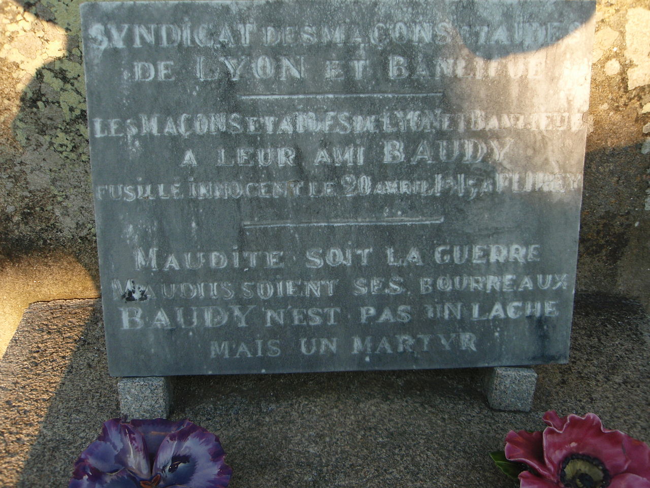 The grave of Félix Baudy, shot to make an example of in 1915 and “rehabilitated” in 1935, is in the nearby town of Royère-de-Vassivière. His Masonic brothers installed a plaque on his grave, which says, “Maudite soit la guerre – Maudits soient ses bourreaux – Baudy n’est pas un lâche – Mais un martyr.” (“Cursed be the war – Cursed be his executioners – Baudy is not a coward – But a martyr.”) On Armistace Day, November 11, a joint ceremony is held at both sites. During the ceremony participants sing La Chanson de Craonne (The Song of Craonne), an anti-military song of World War I. It is sometimes known by the first line of the chorus, Adieu la vie (Goodbye to life.) The video below is from the film “Oh, What a Lovely War!”