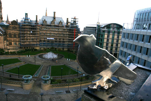 The stainless steel sculpture, by Richard Bartle, featuring seven life-size doves perched on the chimney of Browns Bar next to the Peace Gardens, was inspired by Pablo Picasso’s visit to the Second World Peace Congress held in the Sheffield, England in 1950. The artist used the original poster, designed by Picasso, as a template to create the sculpture, in celebration of the memory of Picasso and the cause of peace.