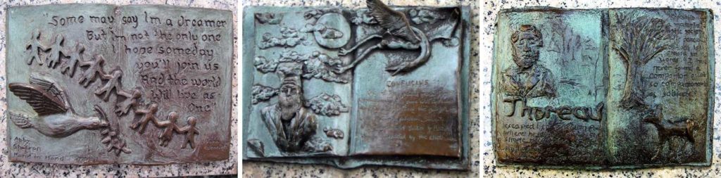 The Peace Fountain was sculpted by the Episcopal Cathedral’s Artist-in-Residence Greg Wyatt to mark the 200th anniversary of the Diocese of New York in 1985. The 40 foot-high bronze sculpture weaves together several representations of the conflict between good and evil. A plaque explains: Peace Fountain celebrates the triumph of Good over Evil, and sets before us the world’s opposing forces—violence and harmony, light and darkness, life and death—which God reconciles in his peace. When the fountain operates, four courses of water cascade down the freedom pedestal into a maelstrom evoking the primordial chaos of Earth. Foursquare around the base, flames of freedom rise in witness to the future. Ascending from the pool, the freedom pedestal is shaped like the double helix of DNA, the key molecule of life. Atop the pedestal a giant crab reminds us of life’s origins in sea and struggle. Facing West, a somnolent Moon reflects tranquility from a joyous Sun smiling to the East. The swirls encircling the heavenly bodies bespeak the larger movements of the cosmos with which earthly life is continuous. Nine giraffes—among the most peaceable of animals—nestle and prance about the center. One rests its head on the bosom of the winged Archangel Michael, described in the bible as the leader of the heavenly host against the forces of Evil. St. Michael’s sword is vanquishing his chief opponent, Satan, whose decapitated figure plunges into the depths, his head dangling beneath the crab’s claw. Tucked away next to the Sun, a lion and lamb relax together in the peace of God’s kingdom, as foretold by the prophet Isaiah. Surrounding the periphery of the sunken plaza in which the fountain sits are plaques, rendered in a style artistically similar to that of the fountain itself, depicting various philosophers, thinkers and artists, most accompanied by a quote by the individual depicted.